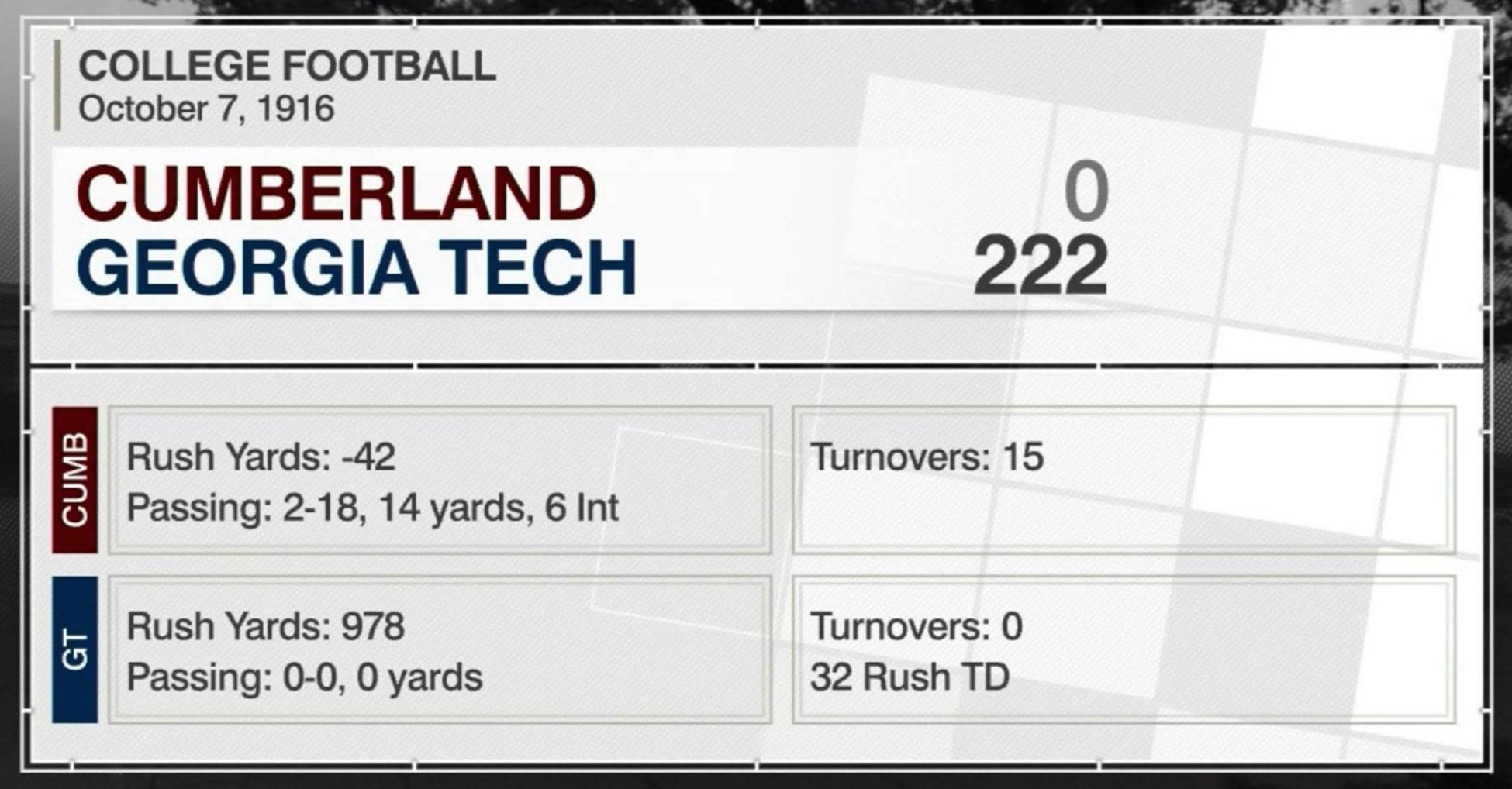 Georgia Tech 978 yards Cumberland -42. In 1916 Cumberland played Georgia Tech and lost 222-0 to a vengeful John Heisman yeah that one. In 1916 they caught the biggest ass whupping ever.